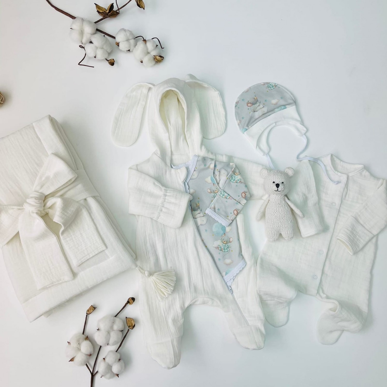 Боди и шапочка из мягкого интерлока, остальные изделия из муслина.