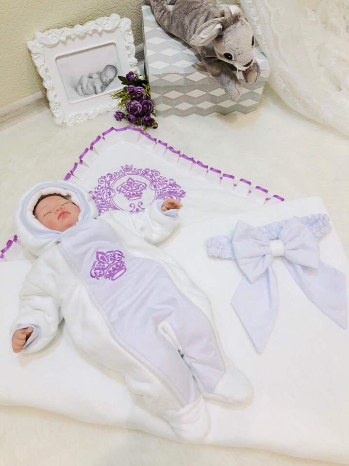 Демисезонный набор на выписку из роддома в универсальной белой расцветке с вышивкой и отделкой сиреневого цвета.