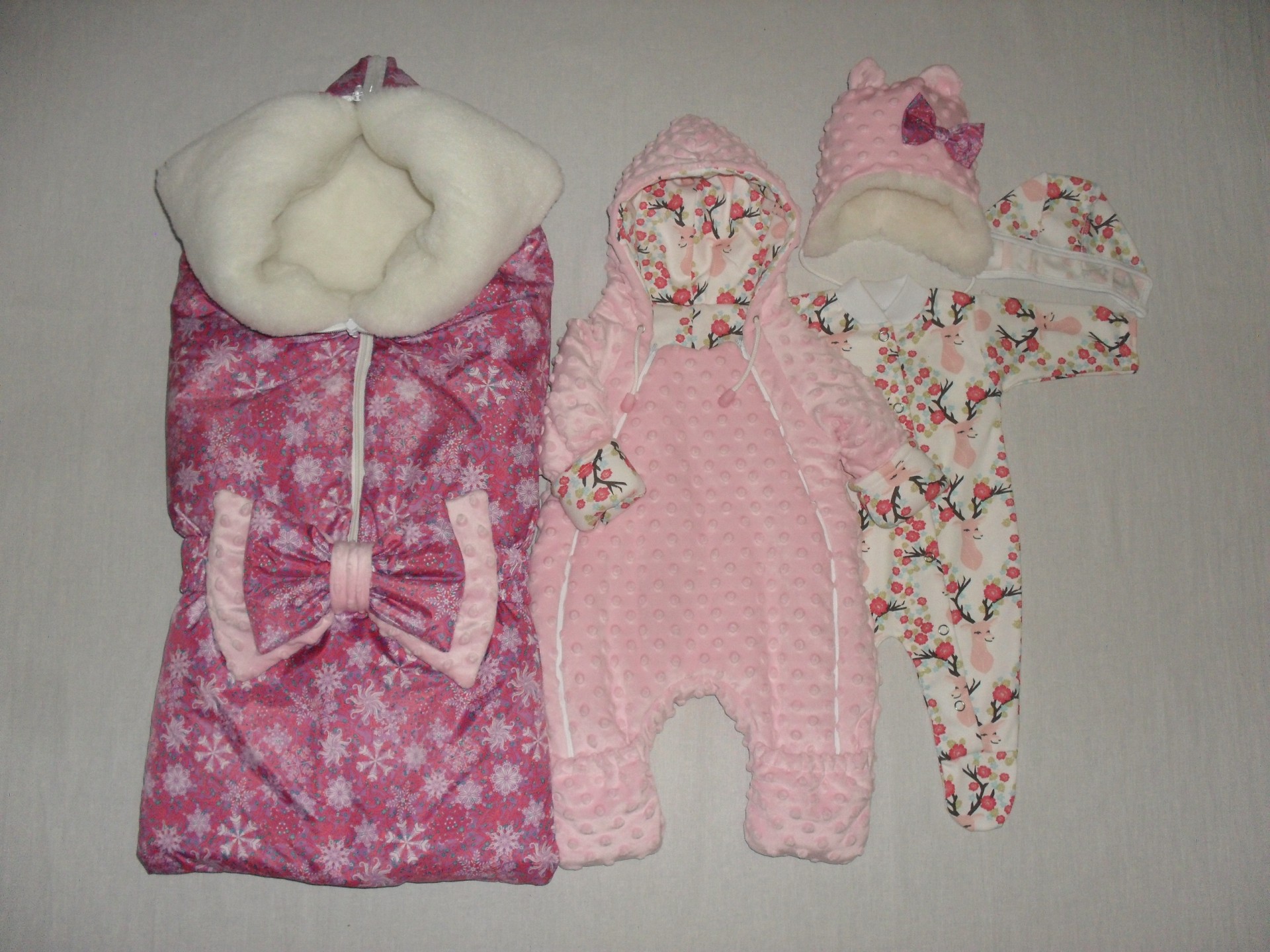 Очень тёплый конверт-трансформер на овчине в наборе с утеплённым и трикотажным комбинезонами и шапочками просто идеален.