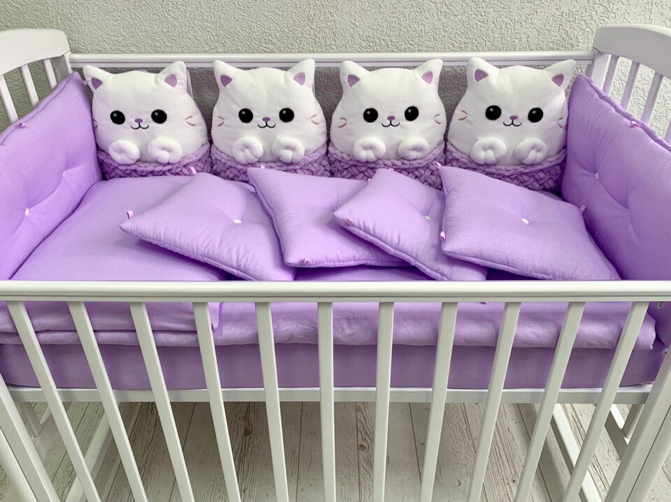 Оригинальные бортики в виде кошечек в лукошке создают дополнительный уют в детской кроватке.